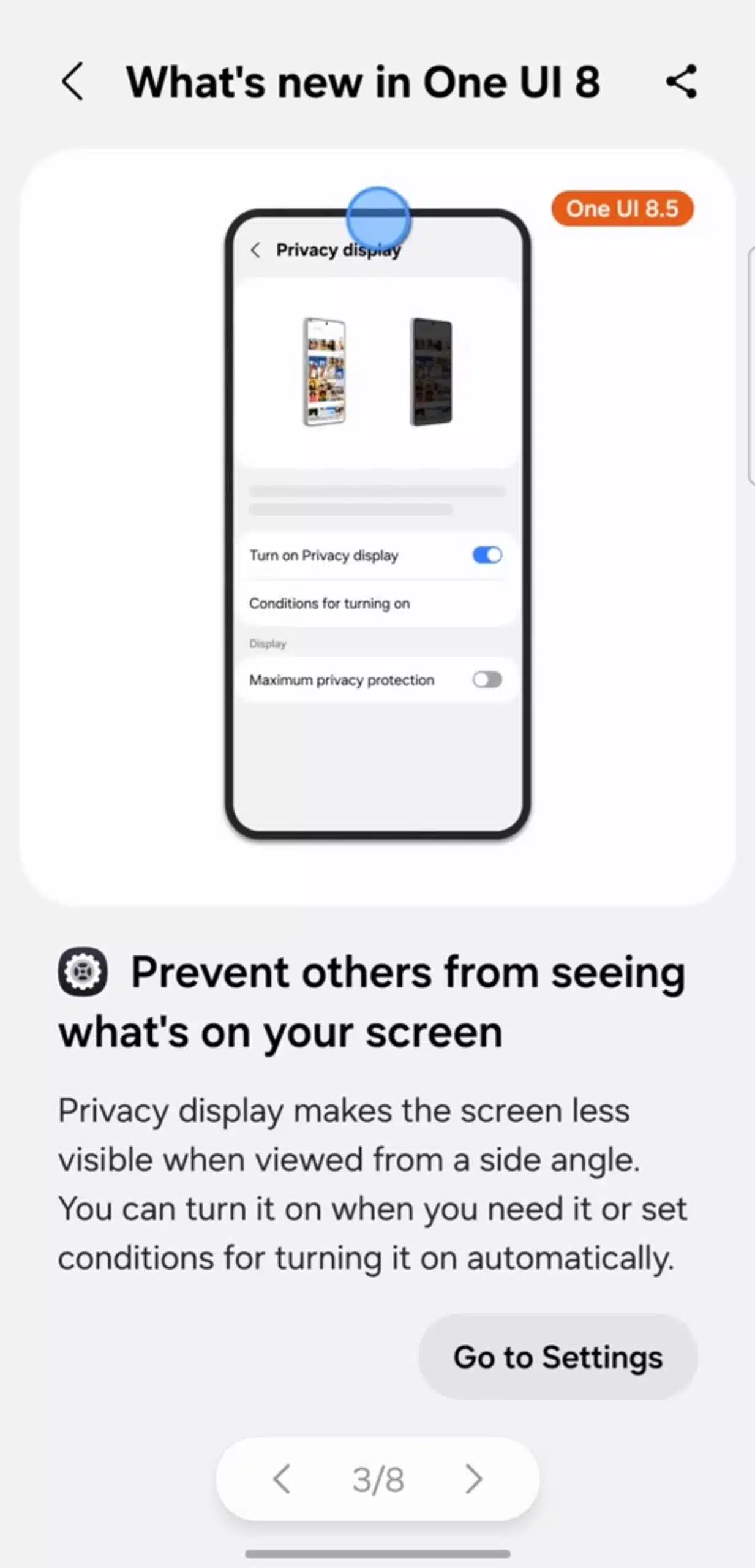 ฟีเจอร์ Privacy Display ในเฟิร์มแวร์ One UI 8.5 จะมีระบุการใช้งานไว้ในแอป Tips ว่าฟีเจอร์นี้จะทำให้หน้าจอมองเห็นได้น้อยลงเมื่อมองจากมุมด้านข้าง เมื่อเราใช้หน้าจอที่มีฟีเจอร์นี้อยู่รอบๆ คนอื่น และเมื่อเปิดใช้งาน Privacy Display คนที่อยู่ข้างๆ จะไม่เห็นสิ่งที่แสดงอยู่บนหน้าจอของเรา