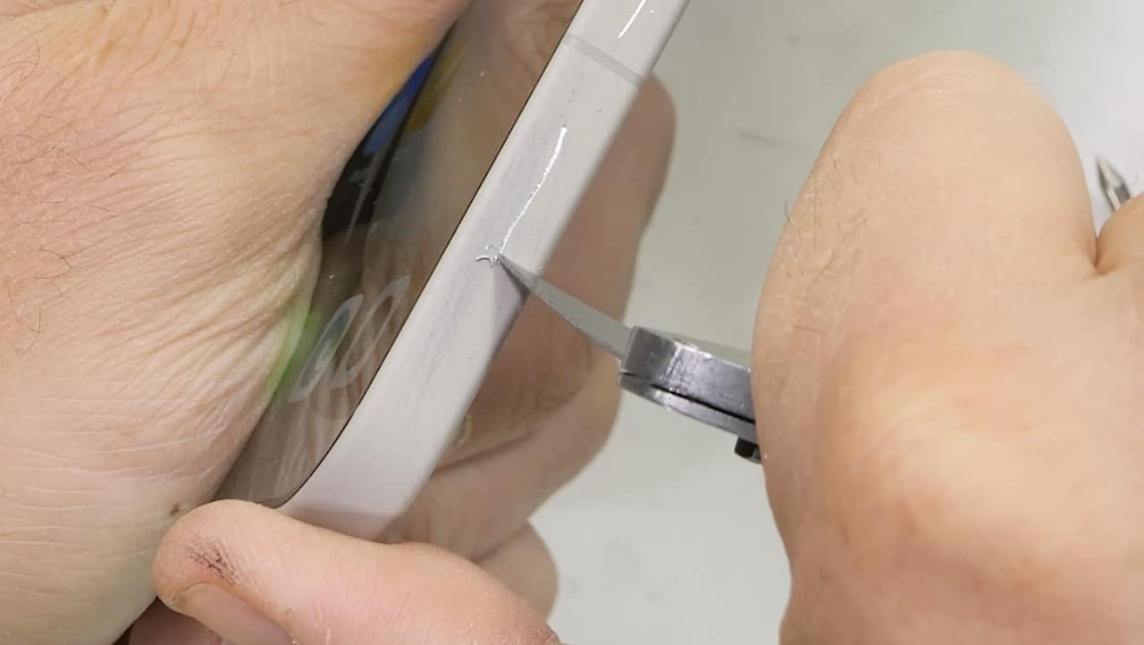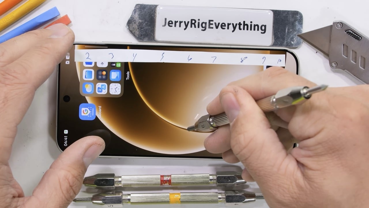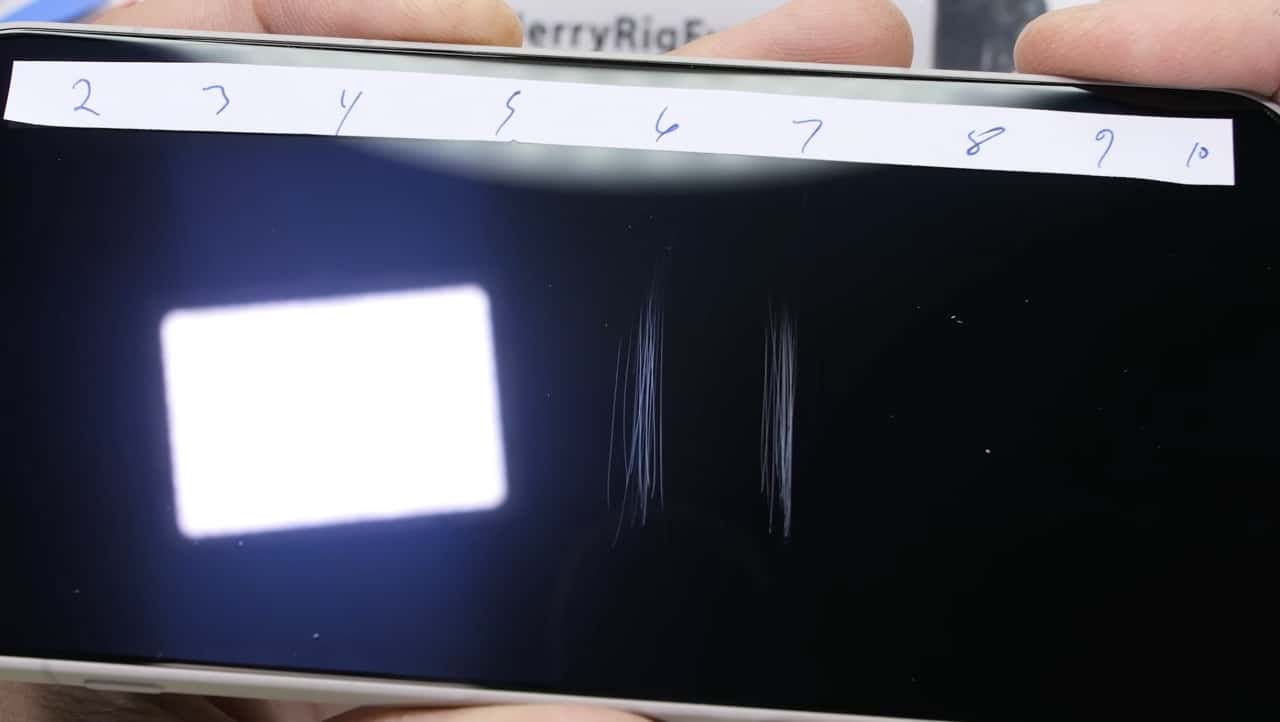 ตัวกรอบเครื่องที่เป็นโลหะก็ยังเกิดรอยได้ถ้าเอามีด JerryRig กรีดลงไปตรง ๆ แต่ที่น่าตกใจคือตัวฝาหลังที่เป็นรอยได้ง่ายเช่นเดียวกัน พี่ Zack บอกว่าฝาหลังนั้นใช้วัสดุพลาสติก ซึ่งเกิดรอยได้หากจงใจ ทั้งตัวมีดกรีด หรือกระทั่งเอาเหรียญมาขูดด้วย