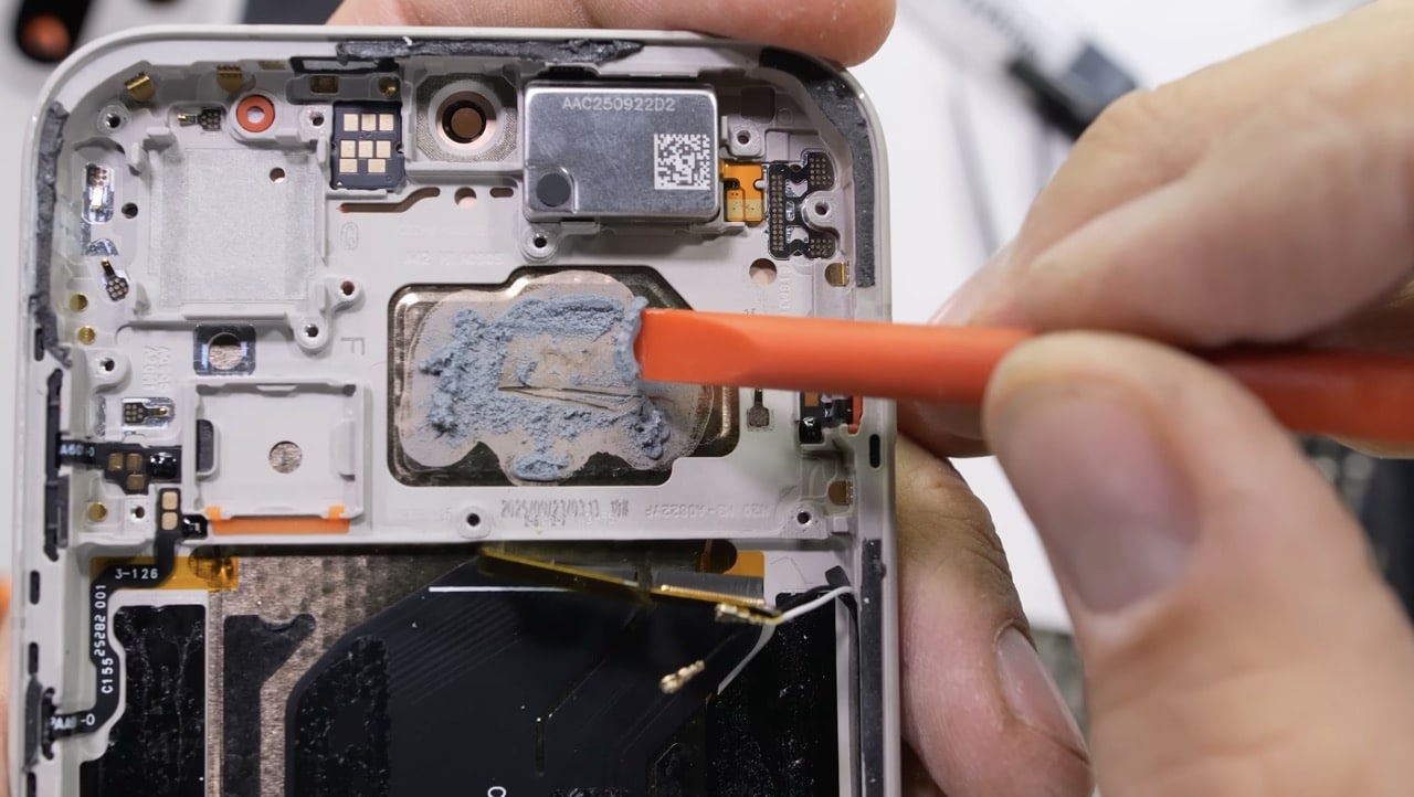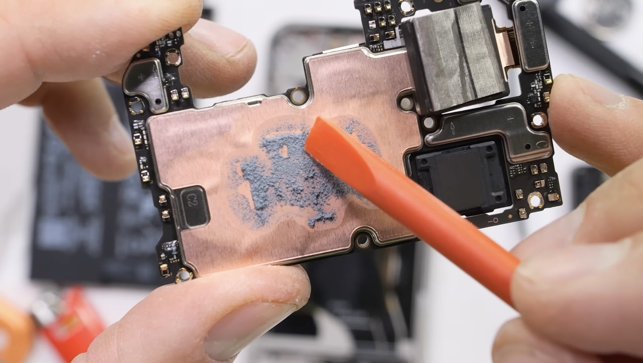 และตัวแผ่น Vapor Chamber ของตัวเครื่องจะถูกติดกับหน้าจอไว้เลย ซึ่งเมื่อแกะหน้าจอออกมาจะเห็นขนาดที่เต็มพื้นที่ไปหมด และมีความบางเฉียบมาก เพื่อกระจายความร้อนออกได้อย่างทั่วถึงนั่นเอง