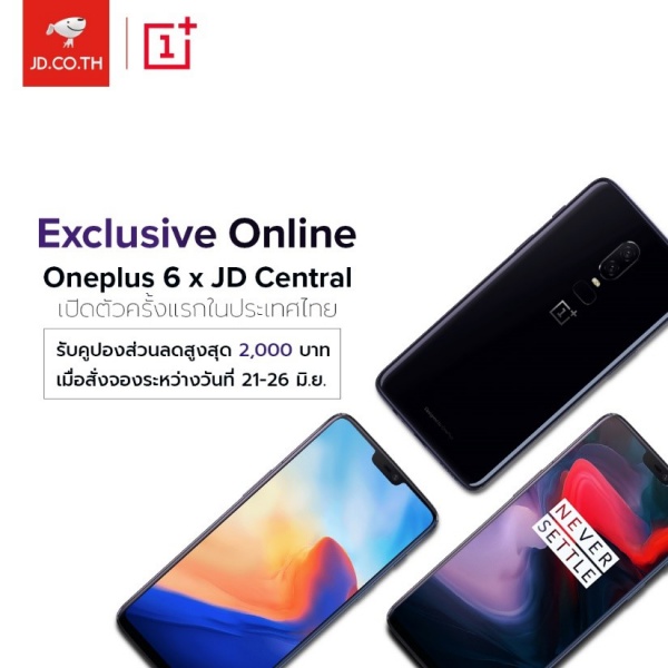 JD CENTRAL ช่องทางจัดจำหน่าย OnePlus 6 ผ่านออนไลน์สุดเอ็กคลูซีฟเป็นครั้งแรก จัดแจกคูปองมูลค่าสูงถึง 2,000 บาท เมื่อสั่งจองเครื่องระหว่างวันที่ 21- 26 มิถุนายน 2561