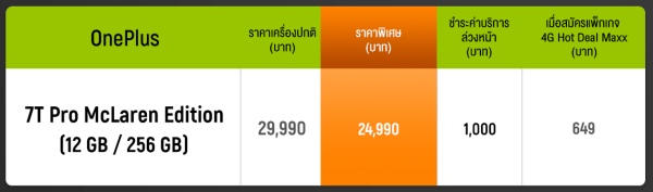 พร้อมกันนี้สามารถซื้อได้ในราคาเริ่มต้นเพียง 24,490 บาท เมื่อซื้อกับผู้ให้บริการเครือข่ายอย่าง AIS สำหรับลูกค้าที่สมัครพร้อมแพ็กเกจ AIS eSports ค่าบริการรายเดือนเริ่มต้นที่ 799 บาท หรือ 999 บาท รับส่วนลดค่าเครื่อง 5,500 บาท เริ่มเพียง 24,490 บาท หรือสมัครแพ็กเกจ 4G AIS Hot Deal Maxx ค่าบริการรายเดือนเริ่มต้นที่ 649 บาท รับส่วนลดค่าเครื่อง 5,000 บาท เริ่มเพียง 24,990 บาท (ลูกค้าต้องชำระค่าบริการล่วงหน้า 1,000 บาท) โดยสามารถสั่งซื้อผ่านช่อทางหน้าร้าน AIS Shop 33 สาขาที่ร่วมรายการ หรือผ่านช่องทางออนไลน์ สามารถดูรายละเอียดเพิ่มเติมได้ที่เว็บไซต์ http://www.ais.co.th/OnePlus7TPro/