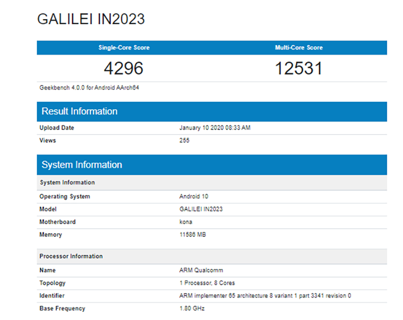 สมาร์ทโฟนที่หลุดมาจาก Geekbench ใช้โมเดลรุ่น “GALILEI IN2023” โดยรันบนระบบปฏิบัติการ Android 10 ควบคู่กับ RAM 12GB และหน่วยประมวลผล Snapdragon 865 ทั้งนี้ ในภาพไม่ได้ระบุถึงชื่อ Snapdragon 865 ตรงๆ แต่หน่วยประมวลผลนี้ตรงกับสเปคของสมาร์ทโฟนจาก Sony ที่จะใช้ขุมพลังตัวนี้เช่นกัน