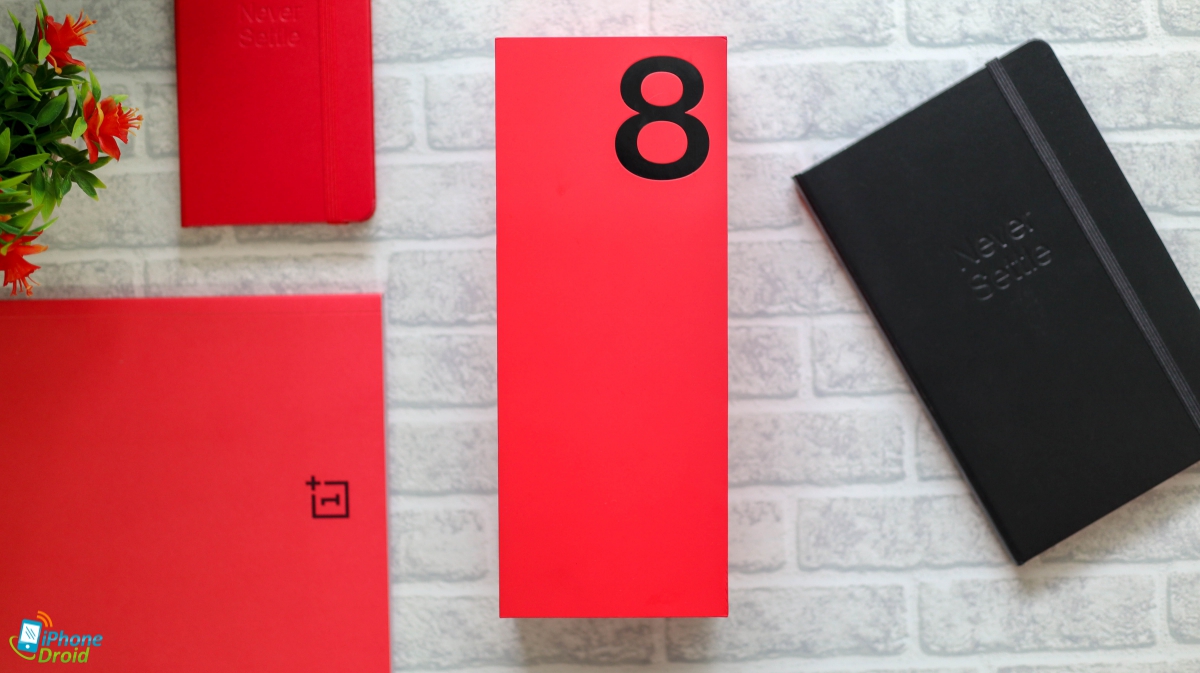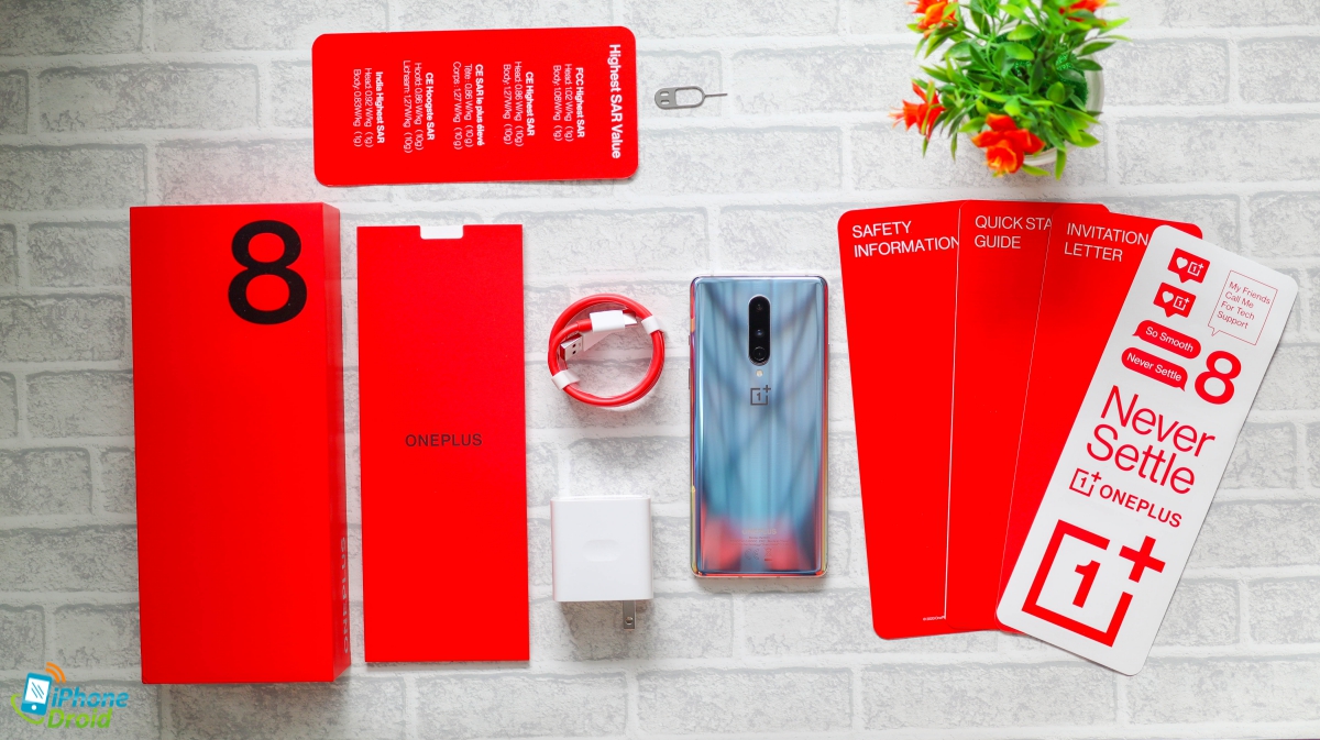 สวยงามตั้งแต่ตัวกล่องเลยทีเดียวสำหรับ OnePlus 8 ที่เป็นเอกลักษณ์ด้วยสีแดงที่เป็นสีของโลโก้ทั้งกล่อง มีเลข 8 ที่ด้านหน้าชัดเจน และด้านหลังก็มีข้อความว่า “เข้าถึงแอป Google ได้ง่ายๆ” โดยมีความยาวตามสไตล์ เมื่อเปิดออกมาก็จะเจอกับอุปกรณ์เพียบครับ
