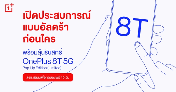 ทาง OnePlus ประเทศไทย จึงขอเรียนเชิญแฟน ๆ ร่วมกิจจกรรม Trail Campaign สัมผัสประสบการณ์แบบอัลตร้าจาก OnePlus 8T 5G ก่อนใครในประเทศไทย สำหรับผู้ที่สนใจเข้าร่วมแคมเปญทดลองเครื่องนาน 10 วัน พร้อมลุ้นรับสิทธิ์ซื้อ OnePlus 8T 5G Pop Up Edition (Limited)