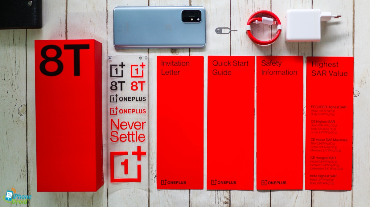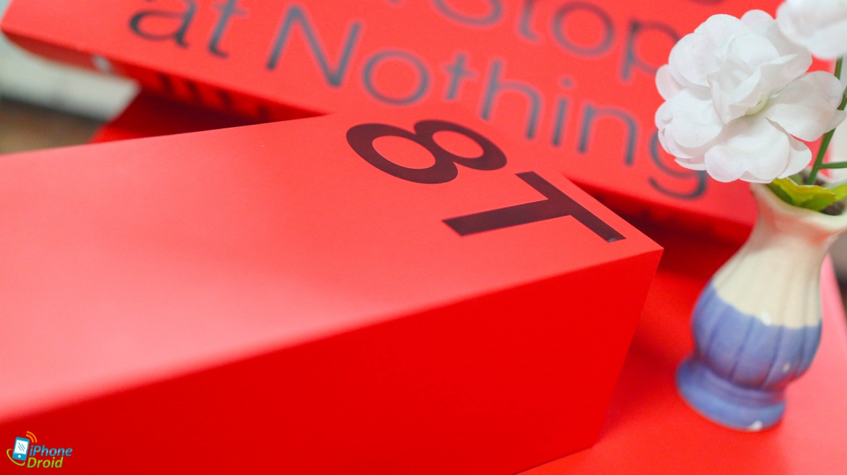 ตัวกล่อง OnePlus 8T 5G มาในเฉดสีแดงเข้มที่มีความร้อนแรง พร้อมชื่อรุ่น 8T ที่ด้านบนชัดเจนครับ