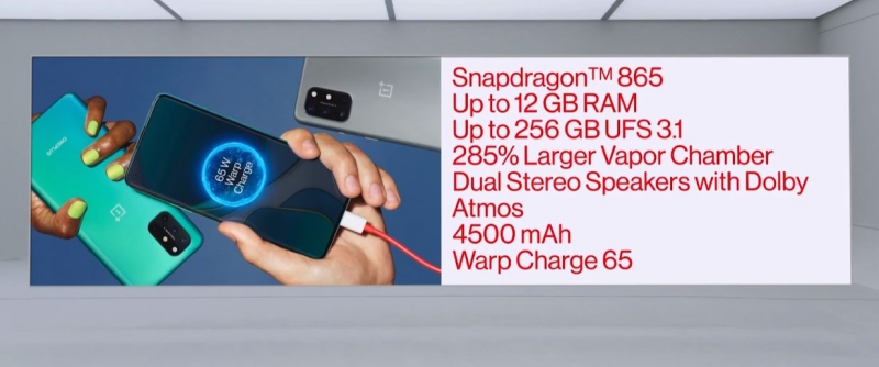 ภายในขับเคลื่อนด้วยหน่วยประมวลผล Snapdragon 865, รองรับ 5G, RAM 8/12GB + ROM UFS 3.1 สูงสุด 256GB พร้อมแบตเตอรี่ 4500mAh รองรับ Warp Charge 65 รันบนระบบปฏิบัติการ Android 11 ครอบทับด้วย OxygenOS และมีระบบเสียง Dolby Atmos