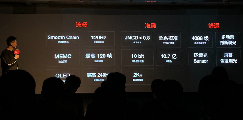 นอกจากนี้ ก็ยังมีในเรื่องของความสว่างที่สามารถปรับได้มากถึง 4096 ระดับ เพิ่มจากเดิมที่ทำได้เพียง 1024 ระดับเท่านั้น ซึ่งสูงที่สุดในสมาร์ทโฟน Android ตอนนี้, การแสดงผล 10-bit HDR, รองรับเทคโนโลยี MEMC ที่ปกติจะเห็นในทีวีเพื่อช่วยเรื่องการชดเชยการเคลื่อนไหวของภาพ ไม่ให้มีการเบลอ และ OnePlus ยังโชว์ตารางของการตอบสนองหน้าจอด้วยว่าตอนนี้ OnePlus มีสมาร์ทโฟนที่ตอบสนองเร็วที่สุดอีกด้วย