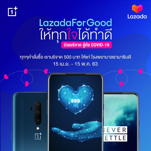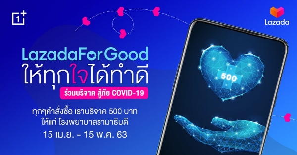 OnePlus และ Lazada ขอเชิญชวนทุกท่านมาร่วมเป็นส่วนหนึ่งของการทำความดี ผ่านโครงการ “LazadaForGood ให้ทุกใจได้ทำดี” เพื่อช่วยเหลือผู้ป่วยและบุคลากรทางการแพทย์ที่ได้รับผลกระทบจาก COVID-19 ด้วยการสนับสนุนเงินช่วยเหลือ 500 บาท โดยทุกบาททุกสตางค์ จากทุกคำสั่งซื้อสมาร์ตโฟนแบรนด์ OnePlus ผ่านร้าน OnePlus Official Store บนช่องทาง Lazada ตั้งแต่วันที่ 15 เม.ย. – 15 พ.ค. 63 จะถูกส่งต่อให้โรงพยาบาลรามาธิบดี โดยไม่มีการหักค่าใช้จ่ายใดๆ เพื่อการจัดซื้อเวชภัณฑ์ เครื่องมือและอุปกรณ์ทางการแพทย์ที่จำเป็น ในการรักษาผู้ป่วยและร่วมแก้ไขปัญหาการแพร่ระบาดของโรคติดเชื้อCovid-19 ที่เพิ่มขึ้นอย่างรวดเร็วทั้งในประเทศไทยแลทั่วโลก ผู้ที่สนใจต้องการสนับสนุนเงินช่วยเหลือได้ที่ “LazadaForGood ให้ทุกใจได้ทำดี” >> https://s.lazada.co.th/s.YkAK3