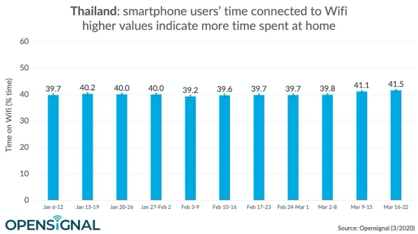 - ผู้ใช้ชาวไทยใช้เวลาเชื่อมต่ออินเทอร์เน็ตผ่าน WiFi บนสมาร์ทโฟน มีเปอร์เซ็นต์เพิ่มสูงขึ้นสัปดาห์ต่อสัปดาห์อย่างมีนัยสำคัญ โดยเฉพาะในช่วงสัปดาห์ที่สองของเดือนมีนาคม (ตั้งแต่วันที่ 9 มีนาคม 2563)