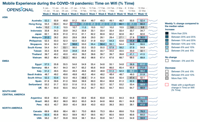บางประเทศมีค่าเปอร์เซ็นต์ของเวลาที่ผู้คนใช้เชื่อมต่ออินเทอร์เน็ตผ่าน WiFi เพิ่มขึ้นในช่วงก่อนที่รัฐบาลจะออกมาตรการกักกันอย่างเป็นทางการ ดังที่เราเห็นในหลายเมืองทางตอนเหนือของประเทศอิตาลีช่วงไวรัสเริ่มระบาด แต่ขณะนี้หลายประเทศได้ประกาศใช้มาตรการกักกันมากขึ้นเรื่อย ๆ เพื่อควบคุมสถานการณ์ และ Opensignal พบว่าเวลาการใช้งานอินเทอร์เน็ตผ่าน WiFi มีการเปลี่ยนแปลงเพิ่มสูงขึ้น ดังนี้
