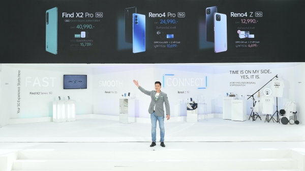 OPPO 5G NOW พร้อมให้คุณสัมผัสสุดยอดประสบการณ์ 5G ที่เร็วกว่า แรงกว่า ได้แล้ววันนี้ กับ สุดยอดสมาร์ทโฟนจาก OPPO ทั้ง 3 รุ่น ครอบคลุมทุกระดับราคา ได้แก่ OPPO Reno4 Z 5G ราคา 12,990 บาท, OPPO Reno4 Pro 5G ราคา 24,990 บาท และ OPPO Find X2 Pro Green Vegan Leather Edition ราคา 40,990 บาท ที่ OPPO Brand Shop และร้านค้าที่ร่วมรายการทั่วประเทศ
