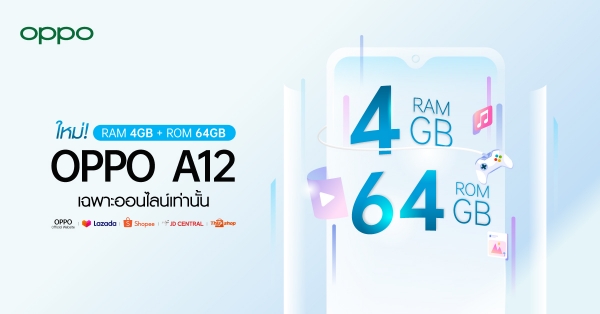 หลังจากได้รับกระแสตอบรับอย่างล้นหลามของ OPPO A12 ครั้งนี้ OPPO จึงเตรียมอัพเกรด RAM เป็น 4GB และ ROM เป็น  64GB เพิ่มประสิทธิภาพการใช้งานให้เร็ว แรง ลื่นไหลยิ่งขึ้น พร้อมจัดเก็บจุใจยิ่งกว่าเดิม