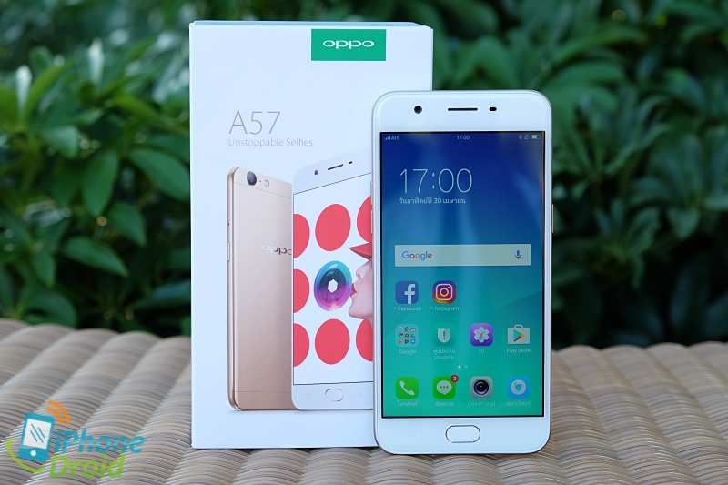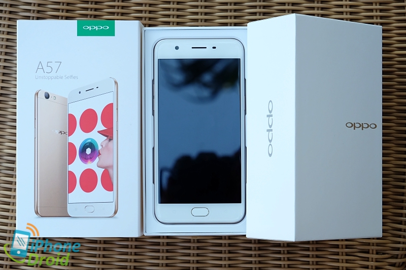OPPO A57 มาในกล่องกระดาษสีขาว สวมทับด้วยปลอกกระดาษที่มีรูปตัวเครื่องระบุชื่อรุ่น OPPO A57 พร้อมสโลกแกน Unstoppable Selfies เซลฟี่สนุก จนหยุดไม่ได้
