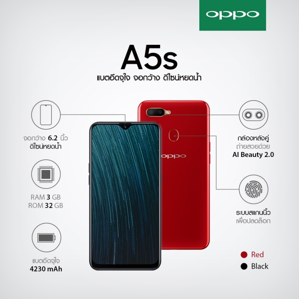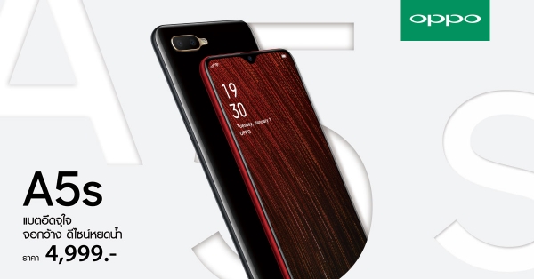 OPPO ได้เปิดตัวสมาร์ทโฟนน้องเล็ก รุ่นล่าสุด OPPO A5s ที่มีการออกแบบได้อย่างทันสมัย และแบตเตอรี่ที่สามารถใช้งานได้