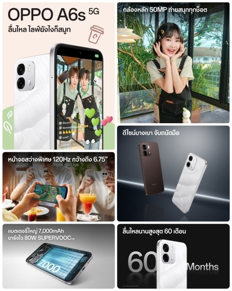 OPPO A6s 5G สมาร์ตโฟนดีไซน์สวย บางเบา จับถนัดมือ พร้อมกล้องคมชัดพิเศษ ถ่ายสนุก ใช้งานสมูทลื่นไหล มาพร้อมกับ 2 สีใหม่ ได้แก่ สีขาว Ice White และสีน้ำตาล Cappuccino Brown พร้อมหน้าจอแสดงผล LCD กว้างขนาด 6.75 นิ้ว และกล้องคมชัดพิเศษ 50MP ถ่ายสนุก ทุกช็อต พร้อมมอบประสบการณ์การใช้งานสุดลื่นไหล ไม่มีสะดุด ด้วยหน้าจออัตรารีเฟรช 120Hz และ ColorOS ที่อัปเกรดยกระดับความราบรื่นไร้รอยต่อ ด้านแบตเตอรี่ขนาดใหญ่ถึง 7,000mAh รับประกันใช้งานนานกว่า 5 ปี และชาร์จไว 80W SUPERVOOC