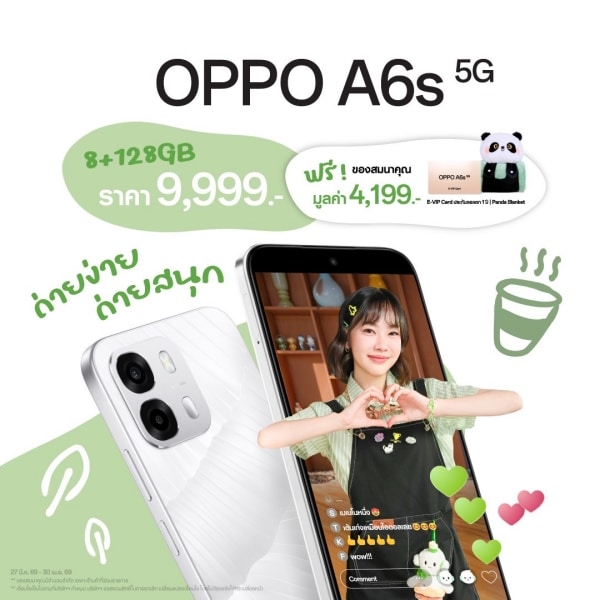 2.       ลูกค้าที่ซื้อรุ่น OPPO A6s 5G (8+128GB) และ OPPO A6s 5G (8+256GB) ในช่วงวันที่ 27 มีนาคม 2569 ถึงวันที่ 30 เมษายน 2569 จะได้รับ Panda Blanket จำนวน 1 ผืน มูลค่า 1,199 บาท