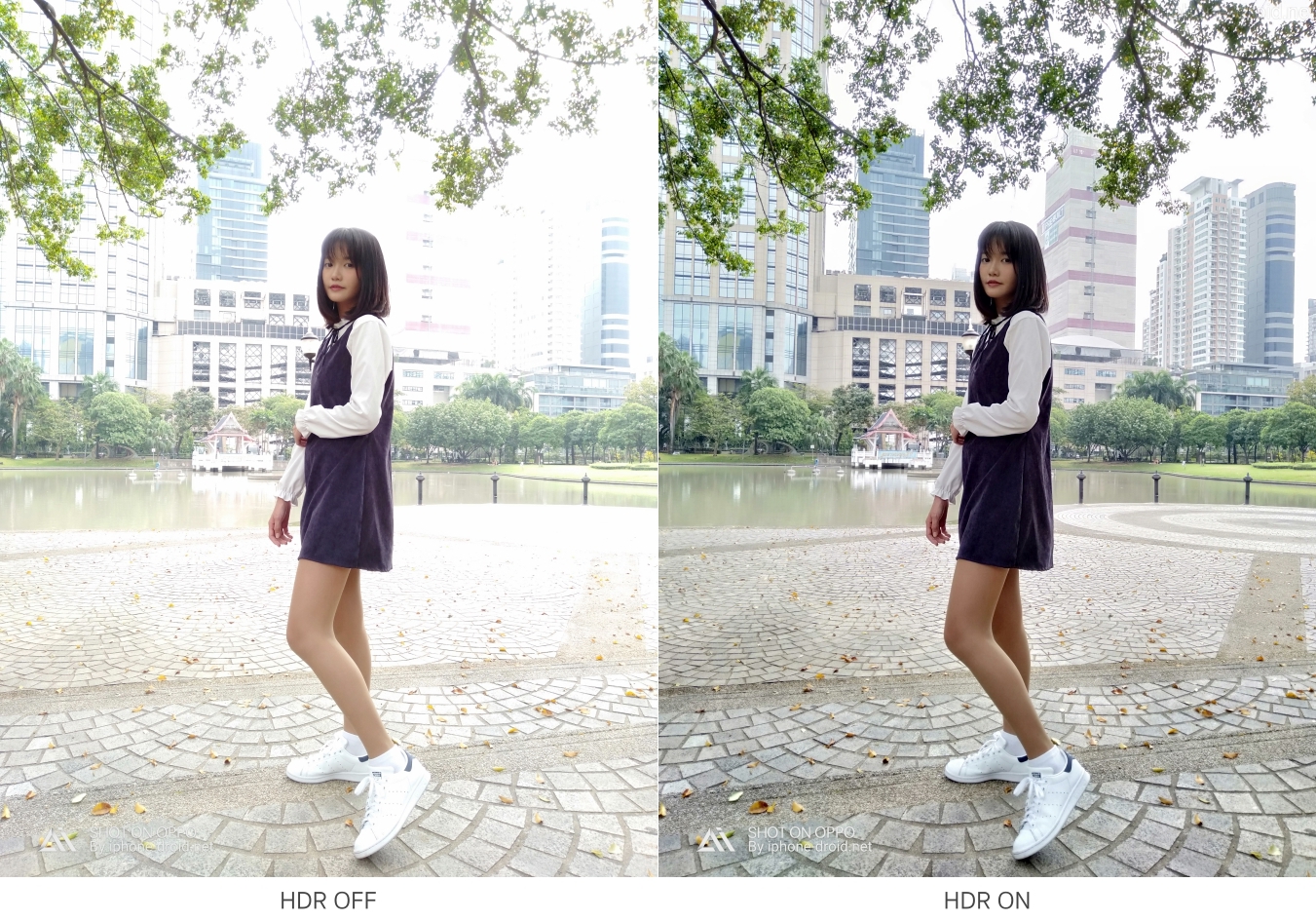 AI Beauty สำหรับกล้องหน้าทำออกมาได้เป็นธรรมชาติมาก สังเกตได้จากผิวหน้าที่มีความขาวเนียน แต่ยังคงให้รายละเอียดของเส้นผมที่คมชัด เก็บสีสันของสภาพแวดล้อมได้สวยสมจริง ไม่ว่าจะเป็นสีดำของเสื้อ และต้นไม้หรือใบไม้ที่เป็นเดียวกับของจริง อีกทั้งยังสามารถถ่ายย้อนแสงหรือที่แสงน้อยได้แบบไม่ต้องกลัวหน้ามืดด้วยโหมด HDR เพื่อให้ได้รายละเอียดของภาพที่คมชัดมากขึ้น