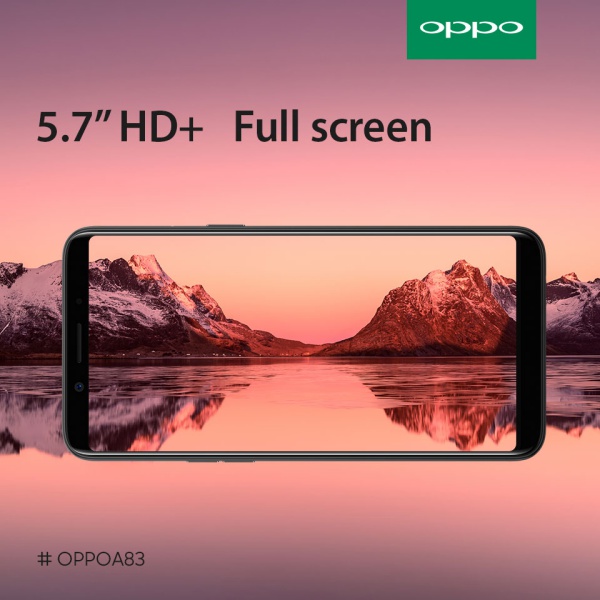 OPPO A83 ขนาด 5.7 นิ้ว มาพร้อมหน้าจอ Full Screen ที่มีขนาดจอภาพถึง 5 นิ้ว พร้อมอัตราส่วนภาพ 18:9 โดยความละเอียดของหน้าจอนั้นสูงถึง 1440 X 720 ช่วยเพิ่มประสบการณ์การรับชมรูปภาพ วีดีโอ หรือเล่นเกมที่กว้างยิ่งขึ้น และยังให้ภาพที่คมชัดอีกด้วย