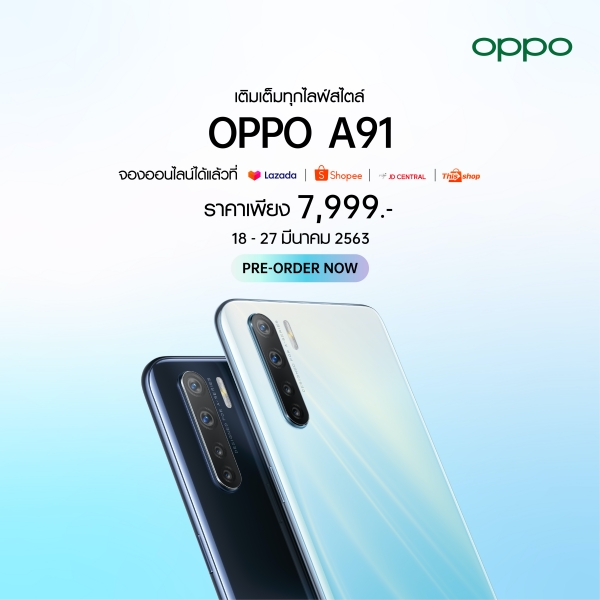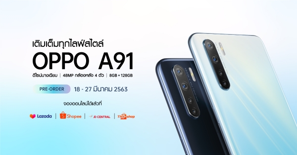 โดย OPPO A91 พร้อมพรีออเดอร์ 2 สี คือ Lightening Black และ Unicorn White ในราคา 7,999 บาท ตั้งแต่วันที่ 18 – 27 มีนาคม 2563 ผ่านช่องทางจัดจำหน่าย 4 ช่องทาง คือ Lazada, Shopee, JD Central และ Thisshop พร้อมส่วนลด ของสมนาคุณและสิทธิพิเศษมากมาย ตามแต่ละช่องทาง ดังนี้