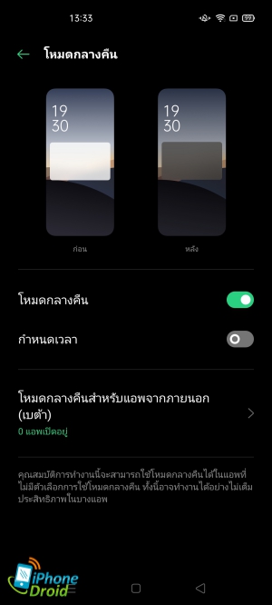 ไม่ใช่แค่โหมดถนอมสายตา แต่ก็มีโหมดมืดให้เหมือนกันครับ ซึ่งนอกจากที่จะไม่ให้หน้าจอทำร้านดวงตามากจนเกินไปแล้ว โหมดมืดก็ยังช่วยให้รุ่นนี้ที่ใช้จอ AMOLED ประหยัดแบตเตอรี่เพิ่มขึ้นด้วย