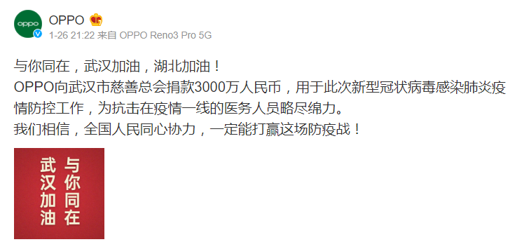 OPPO ได้ร่วมกันบริจาคเงินกว่า 30 ล้านหยวน หรือราวๆ 132 ล้านบาทให้กับสหพันธ์การกุศลอู่