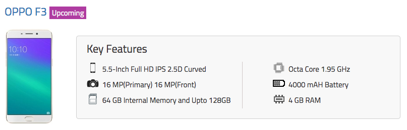 สเปคอย่างไม่เป็นทางการของ OPPO F3 จาก Mobilekaprice บอกว่ามีหน้าจอขนาด 5.5 นิ้ว Full HD มาพร้อม Android 7.0 Nougat ใช้ชิปเซ็ต Snapdragon 653 กับแรม 4GB และแบตเตอรี่ขนาดใหญ่ 4,000 mAh รองรับชาร์จเร็ว VOOC