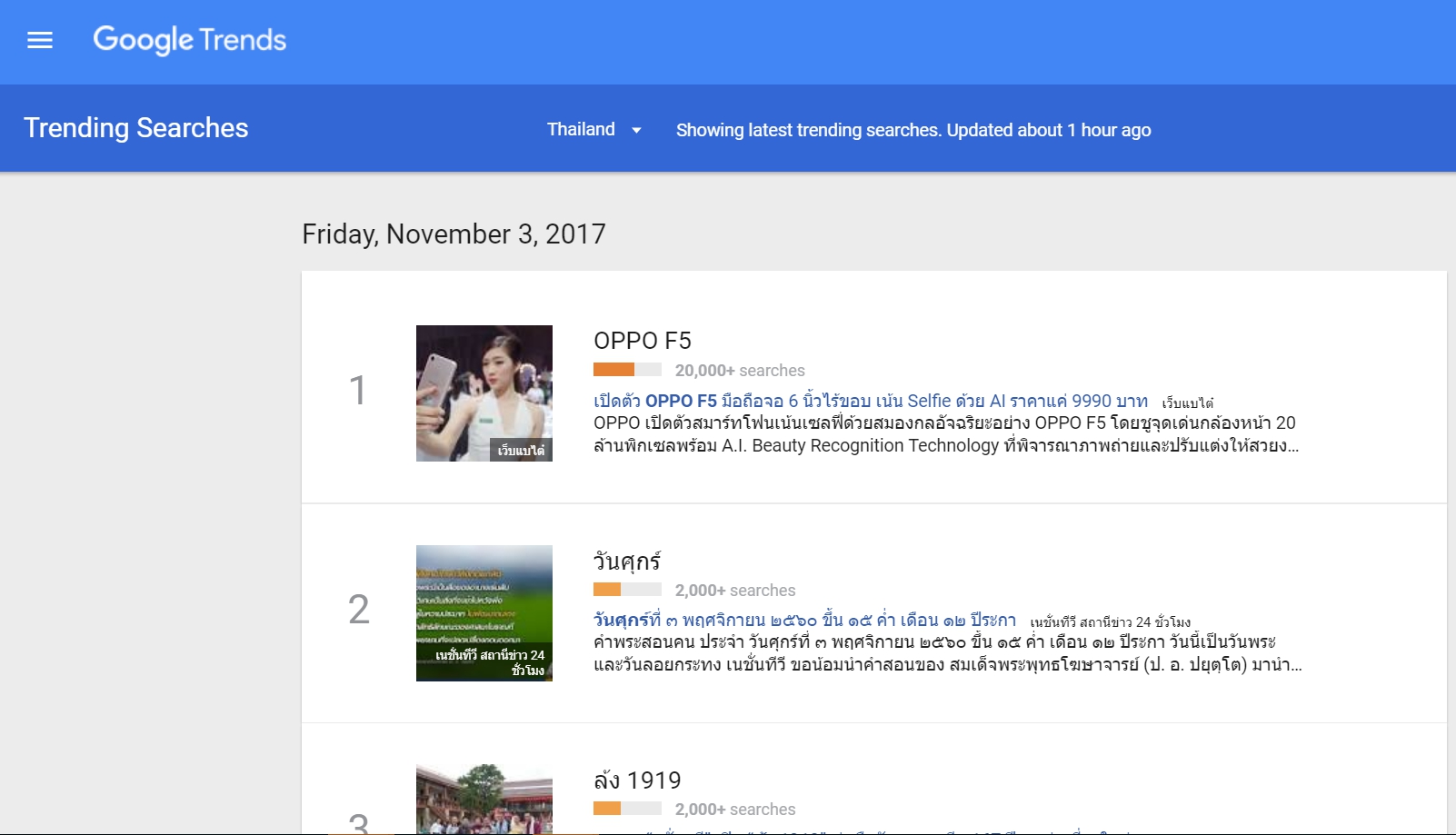 นั่นก็คือ OPPO F5 สมาร์ทโฟนที่มาพร้อมดีไซน์หน้าจอแบบ Full Screen รุ่นแรกของ OPPO ที่เพิ่งเปิดตัวอย่างเป็นทางการในไทยไปเมื่อวันที่ 2 พฤศจิกายนที่ผ่านมา ซึ่งได้ ณเดชน์ คูกิมิยะ มาเป็นพรีเซ็นเตอร์คนล่าสุดด้วย กระแสของทั้งตัวพรีเซนเตอร์และสมาร์ทโฟนที่น่าสนใจนี่เอง ทำให้เปิดตัวไปได้เพียงวันเดียว OPPO F5 ก็ขึ้นแท่นติดชาร์จอันดับ 1 บน Google Trends เมื่อวันที่ 3 พฤศจิกายนที่ผ่านมา ซึ่งเป็นตัวการันตีคว่าสมาร์ทโฟนรุ่นนี้ได้รับความสนใจจากผู้ใช้งานเป็นจำนวนมากจริงๆ