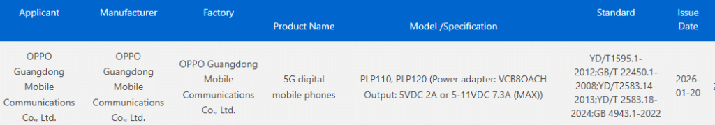 มาดูที่ Find N6 กันก่อน มาในโมเดล PLP110 ที่คาดว่าจะเป็นรุ่นปกติ และ PLP120 ที่อาจจะเป็นรุ่น Beidou Edition เพื่อรองรับการเชื่อมต่อผ่านดาวเทียมได้ โดยทั้ง 2 โมเดลจะรองรับการชาร์จเร็ว 80W ซึ่งก็เท่าเดิมกับ Find N5 ที่ชาร์จเร็วด้วยสาย 80W และมuไร้สายที่ 50W ด้วย ดังนั้น Find N6 ก็น่าจะรองรับชาร์จไร้สายในความเร็วเท่ากันครับ