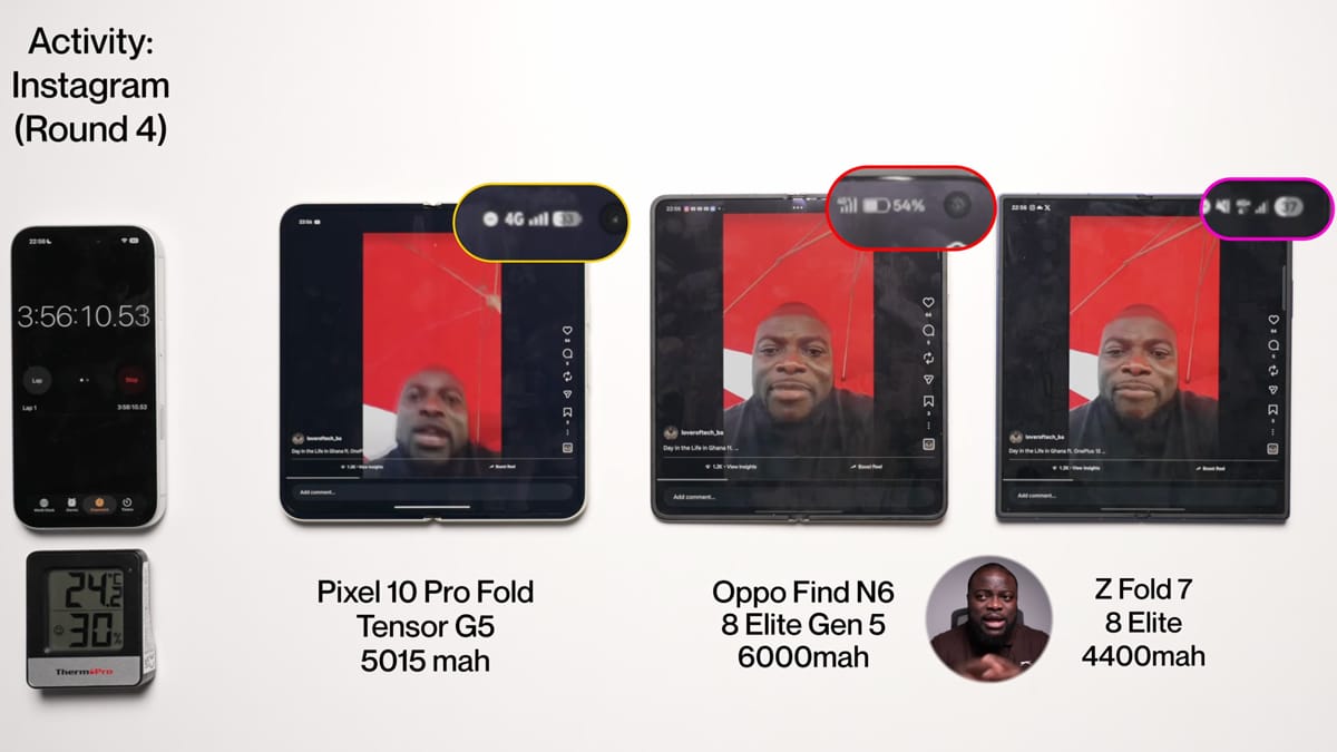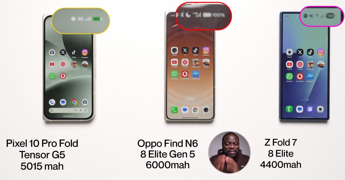 ช่อง Lover of Tech ปล่อยคลิปทดสอบแบตเตอรี่ของ OPPO Find N6 เรือธงจอพับรุ่นใหม่ออกมาแล้วครับ รอบนี้จับเทียบกับคู่แข่งอย่าง Galaxy Z Fold7 และ Pixel 10 Pro Fold ด้วย มาดูกันดีกว่าว่าแต่ละรุ่นจะใช้งานได้แตกต่างกันแค่ไหน