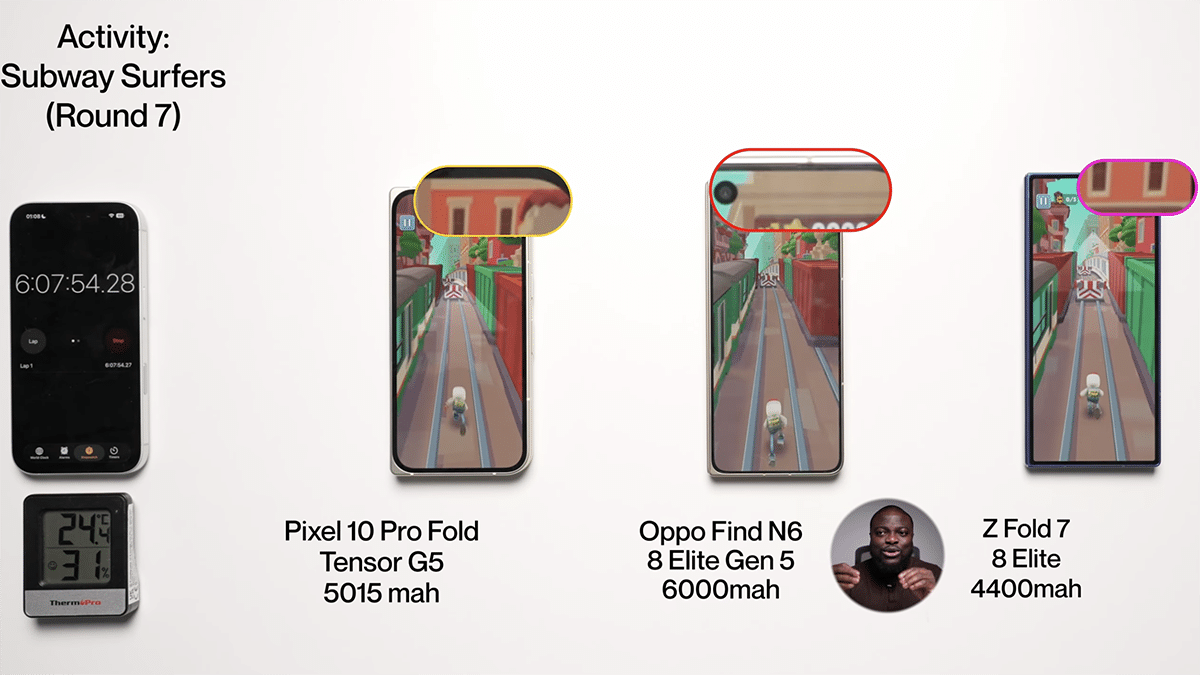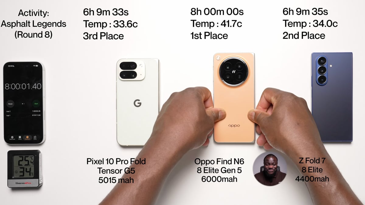 จะเห็นว่าฝั่ง Z Fold7 และ Pixel 10 Pro Fold นั้นทำเวลาได้ใกล้เคียงกันมาก แม้ความจุแบตเตอรี่จะต่างกันพอสมควร แต่หากนำมาเทียบกับ OPPO Find N6 รุ่นใหม่ที่มีแบตเยอะกว่ามาก เวลาการใช้งานก็ต่างกันเกือบ 2 ชม.เลยทีเดียว ถือว่าจัดเต็มมากสำหรับ OPPO ในปีนี้!