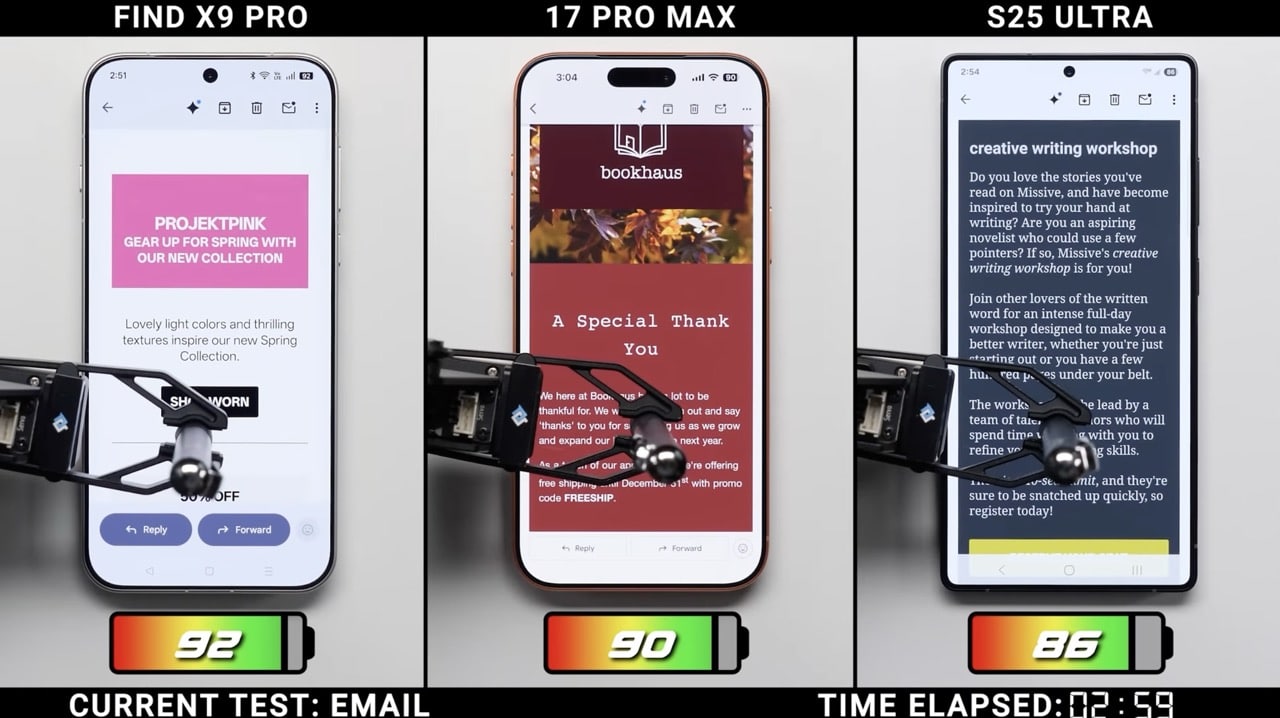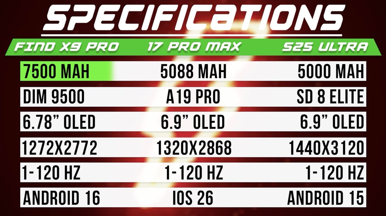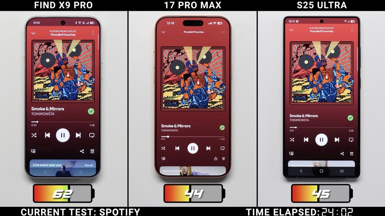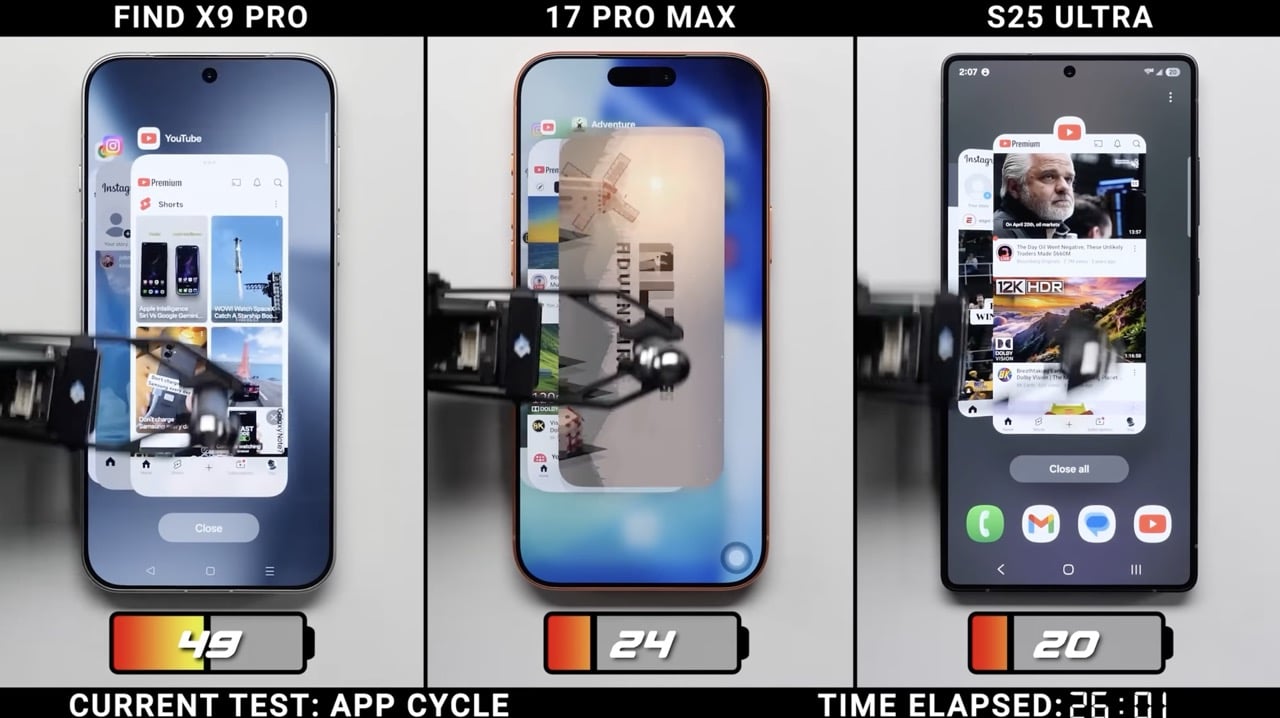 OPPO Find X9 Series เปิดตัวในตลาด Global เรียบร้อย รอบนี้จัดเต็มมาครบไม่ใช่แค่กล้องหรือชิปเซ็ต แต่แบตเตอรี่ก็อัดแน่นมามากถึง 7500mAh อีกด้วย ล่าสุดช่อง PhoneBuff ก็ได้ทำคลิปทดสอบแบตเตอรี่เทียบกับ iPhone 17 Pro Max และ Galaxy S25 Ultra ออกมาแล้ว!