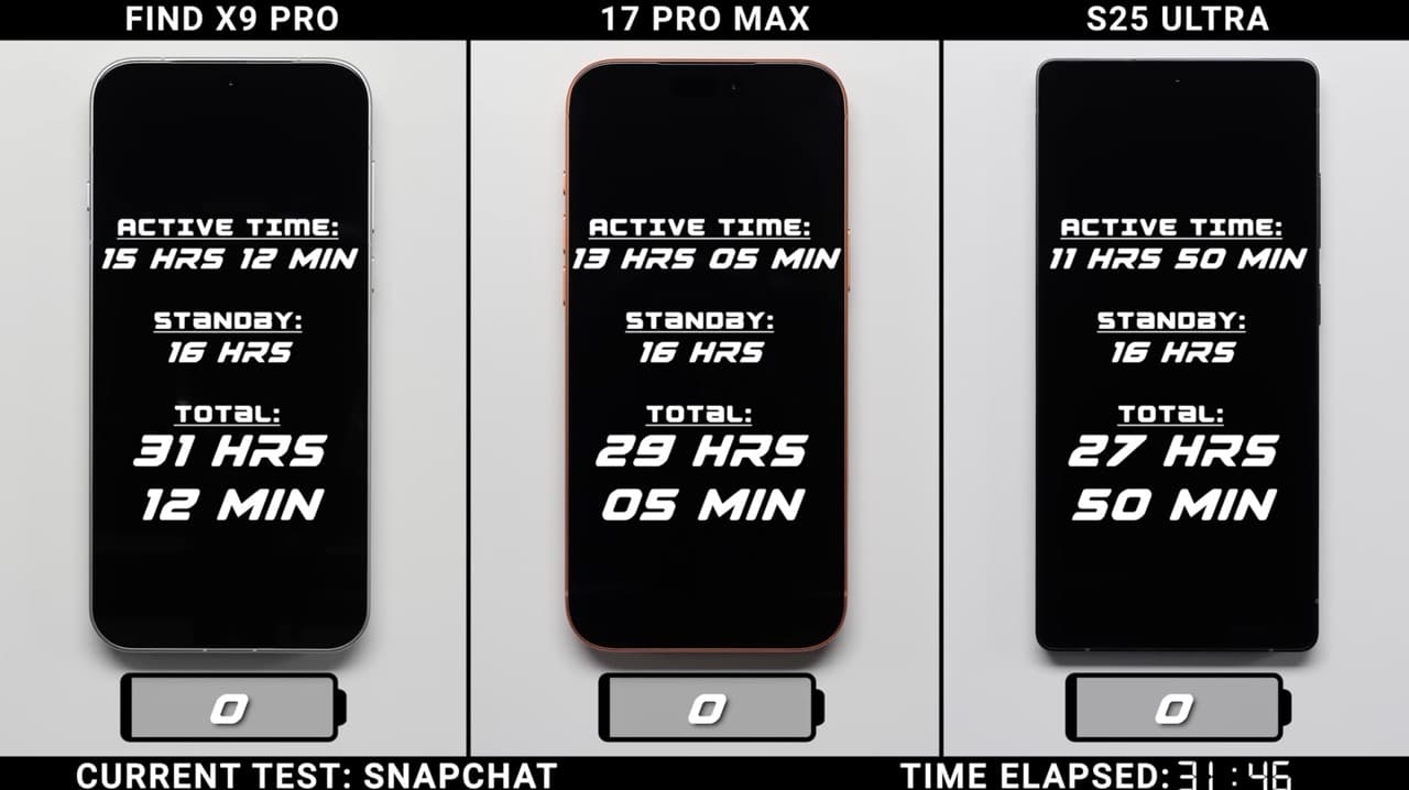 - OPPO Find X9 Pro = ใช้งานต่อเนื่อง 15.12 ชม. | สแตนบายด์ 16 ชม. | รวมเป็น 31.12 ชม.