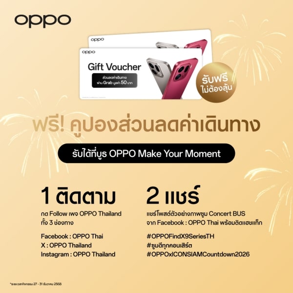 เตรียมพบกับกิจกรรมสุดพิเศษจาก OPPO ห้ามพลาดกับการเก็บภาพโมเมนต์อันน่าประทับใจ และพบกับมหาปรากฏการณ์เฉลิมฉลองส่งท้ายปีที่ยิ่งใหญ่ที่สุดของไทย  Amazing Thailand Countdown 2026 มหาปรากฏการณ์เคานต์ดาวน์ ผนึกกำลังสุดยิ่งใหญ่ สุดยอดประสบการณ์เหนือความคาดหมาย ระหว่างวันที่ 27-31 ธันวาคม 2568 นี้ ณ ริเวอร์ พาร์ค ไอคอนสยาม เท่านั้น!