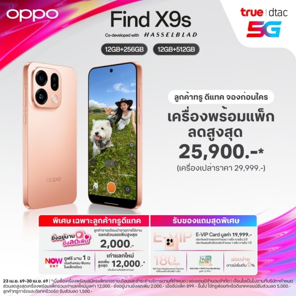 สามารถจองเป็นเจ้าของได้แล้ววันนี้ OPPO Find X9 Ultra และ OPPO Find X9s สั่งซื้อได้แล้วตั้งแต่วันนี้เป็นต้นไป ด้วยราคาสุดพิเศษจากกลุ่มทรู ที่ทรูช็อป ศูนย์บริการดีแทคทั่วประเทศที่ร่วมรายการ