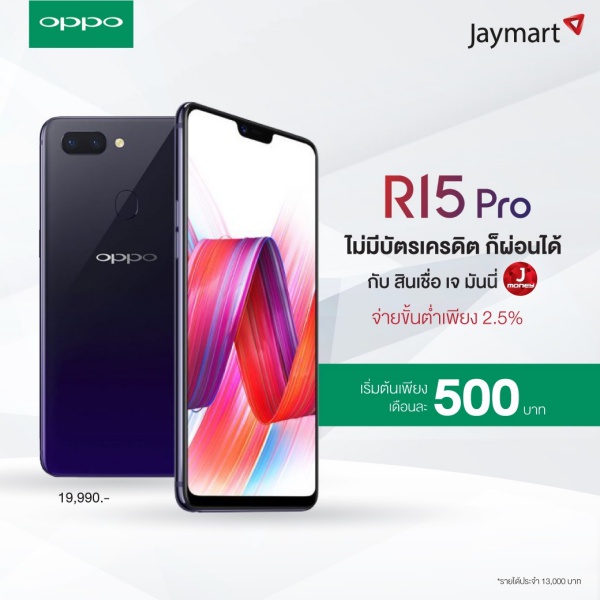 ผู้สนใจสามารถสั่งจอง OPPO R15 Pro ได้ตั้งแต่วันนี้จนถึงวันที่ 1 มิ.ย.ในราคา 19,990 บาทที่ร้าน Jaymart ทุกสาขา โดยจะได้รับของแถมสุดพิเศษเป็น VIP card ซึ่งเป็นประกันหน้าจอแตกนาน 1 ปี และ Special gift box เป็นสายชาร์จ VOOC + หัวชาร์จเร็วบนรถยนต์รวมมูลค่ามากกว่า 3,000 บาท พิเศษสุดๆ เป็นเจ้าของ OPPO R15 Pro ได้ง่ายๆ ผ่อนเริ่มต้นแค่ 500 บาทไม่ต้องใช้บัตรเครดิตโดยแบ่งชำระขั้นต่ำ 2.5% ของวงเงินที่ใช้ไป #มีมากจ่ายมากมีน้อยจ่ายน้อย สมัครง่าย อนุมัติเร็ว กับ สินเชื่อ เจ มันนี่ เพียงแค่มีรายได้ 13,000 บาท และรับส่วนลดเพิ่มสูงสุด 6,000 บาท เมื่อสมัครแพ็คเกจกับ AIS, True Move H และ Dtac โดยสมัครและพบโปรโมชั่นดีๆได้ที่ร้าน Jaymart ทุกสาขา หรือโทร 02-308-8000