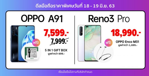 และเมื่อซื้อ OPPO A91 สมาร์ทโฟนยอดฮิตที่ขายดีที่สุดใน OPPO Official Store ลดเหลือเพียง 7,599 บาท จากปกติ 7,999 บาท รับฟรี! 5 IN 1 Gift Box มูลค่า 699 บาท หรือ เมื่อซื้อ OPPO A91 พร้อมหูฟัง OPPO Enco M31 ลดเหลือเพียง 8,699 บาท จากปกติ 9,198 บาท และ OPPO Reno3 Pro กล้องหน้าคู่ 44MP สวยชัดที่สุดในโลก ราคา 18,990 บาท ผ่าน OPPO Official Store รับฟรี! หูฟัง OPPO Enco M31 มูลค่า 1,699 บาท