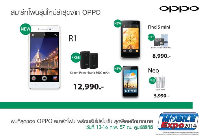 ราคาสมาร์ทโฟนรุ่นใหม่ล่าสุด จาก Oppo ที่พร้อมจำหน่ายในงาน Thailand Mobile Expo 2014
