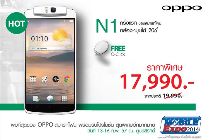 พบกับ Oppo N1 ลดราคาจาก 19,990 บาท เหลือเพียง 17,990 บาท ฟรี O – Click ในงาน Thailand Mobile Expo 2014 วันที่ 13-16 ก.พ.นี้ ที่ศูนย์ประชุมแห่งชาติสิริกิติ์