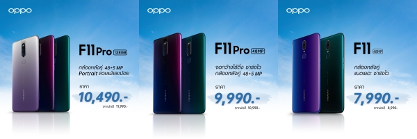 OPPO F11 อีกหนึ่งรุ่นเล็กสเปคแน่น เพราะมีทั้งกล้องหลังคู่ 48+5 ล้าน ระบบชาร์ไว VOOC Flash Charge 3.0 พร้อมแบตเตอร์รี่ 4020 mAh พร้อมหน้าจอ Waterdrop Screen กว้าง 6.5 นิ้ว RAM 4 GB + ROM 128 GB ในราคา 7,990 บาท