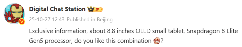 โดย Digital Chat Station รายงานว่าแท็บเล็ต OPPO รุ่นนี้จะใช้หน้าจอ OLED ขนาด 8.8″ และมีชิปเซ็ต Snapdragon 8 Elite Gen 5 ซึ่งนอกจาก 2 เรื่องนี้แล้ว ก็ยังไม่มีข้อมูลเรื่องสเปคอื่น ๆ เพิ่มเติมเนาะ