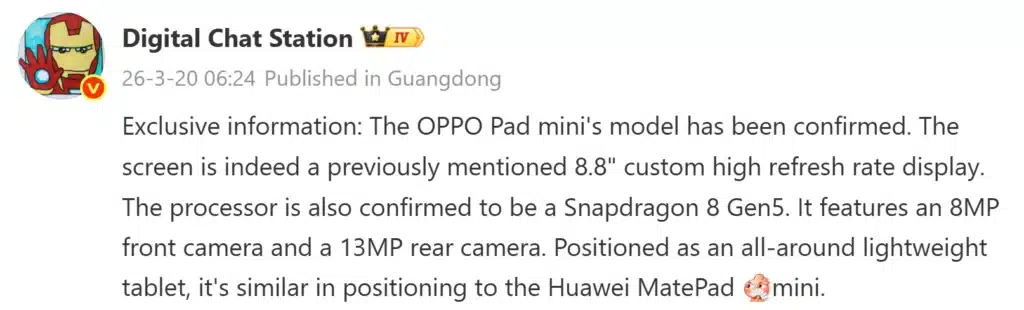หลุดสเปค OPPO Pad Mini ได้จอขนาด 8.8″ พร้อมชิป Snapdragon 8 Gen 5