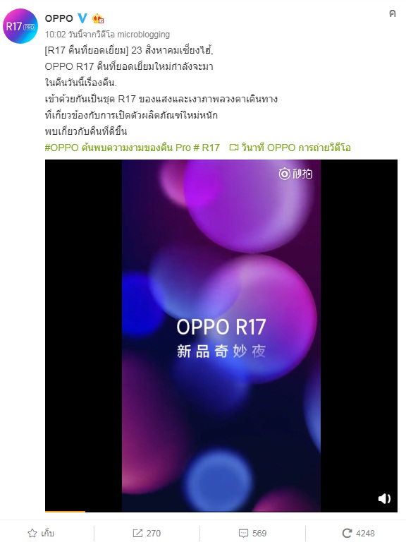 ชัดเจน Oppo R17 จะเปิดตัวในวันที่ 23 สิงหาคมนี้