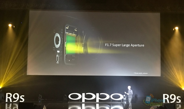 OPPO R9s มีการปรับดีไซน์ให้โดดเด่นมากยิ่งขึ้น ด้วยหน้าจอที่กว้างถึง 74.3 มิลลิเมตร ผสานกับเทคโนโลยีกล้องระดับเวิลด์คลาส ด้วยกล้องที่มีความละเอียดถึง 16 ล้านพิกเซลทั้งด้านหน้าและหลัง พร้อมกับเซนเซอร์อัจฉริยะ Sony IMX398 ภายใต้ความร่วมมือของออปโป้และบริษัทโซนี่ ที่มีประสิทธิภาพสูงและมีรูรับแสงกว้างเป็นพิเศษถึง F/1.7 ทำให้สามารถโฟกัสได้อย่างรวดเร็ว