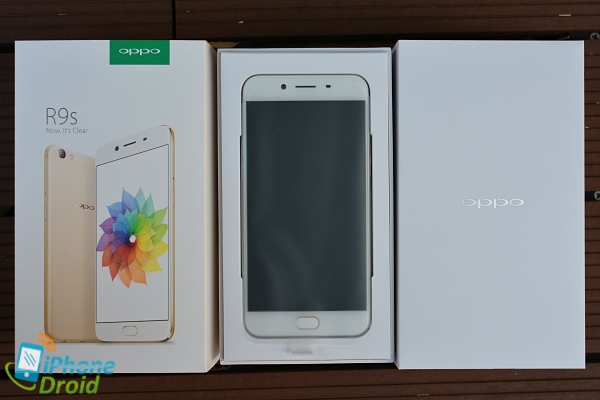 OPPO R9s มาในกล่องกระดาษสีขาวเรียบ พร้อมชื่อรุ่นบนฝากล่องและมีสโลแกน Now, It’s Clear ซึ่งเป็นฟีเจอร์เด่นของรุ่นนี้ในเรื่องของกล้องถ่ายรูปที่ถ่ายได้ชัดและสว่างกว่าเคย