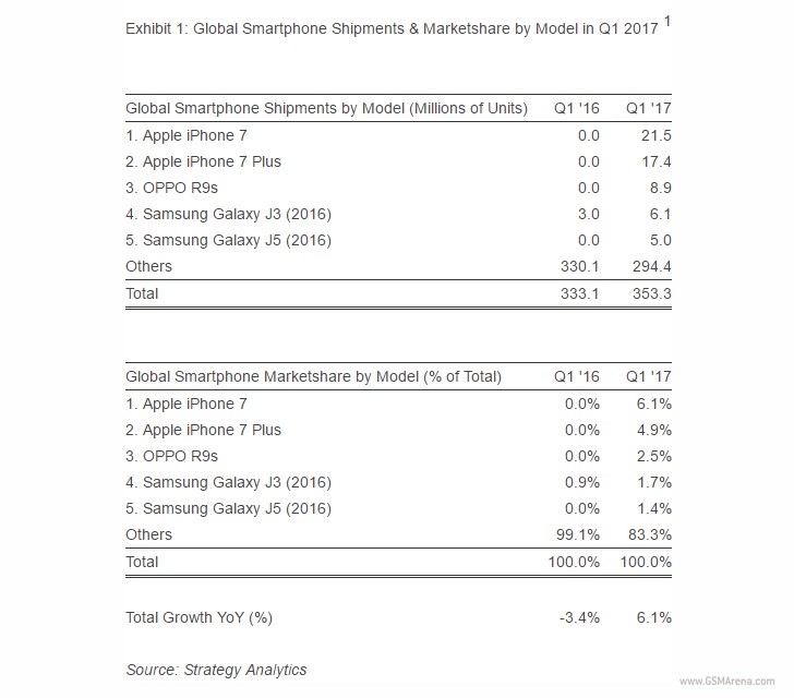 อีกรุ่นน่าสนใจไม่แพ้กันก็คือรุ่น Galaxy J3 (2016) ที่มียอดจัดส่งไตรมาสแรกของปีที่แล้ว 3 ล้านเครื่อง แต่ก็ยังขายดีมาจนถึงไตรมาสแรกของปีนี้ โดยมียอดจัดส่งสูงขึ้นถึง 6.1 ล้านเครื่อง แต่จะเห็นว่าไตรมาสแรกของปีนี้ ไม่มีสมาร์ทโฟนรุ่นไฮเอนด์จาก Samsung ซึ่งสาเหตุหนึ่งคาดว่ามาจาก Galaxy Note7 ไม่ได้วางขายเมื่อช่วงปลายปีที่ผ่านมา ด้วยปัญหาเกี่ยวกับแบตเตอรี่