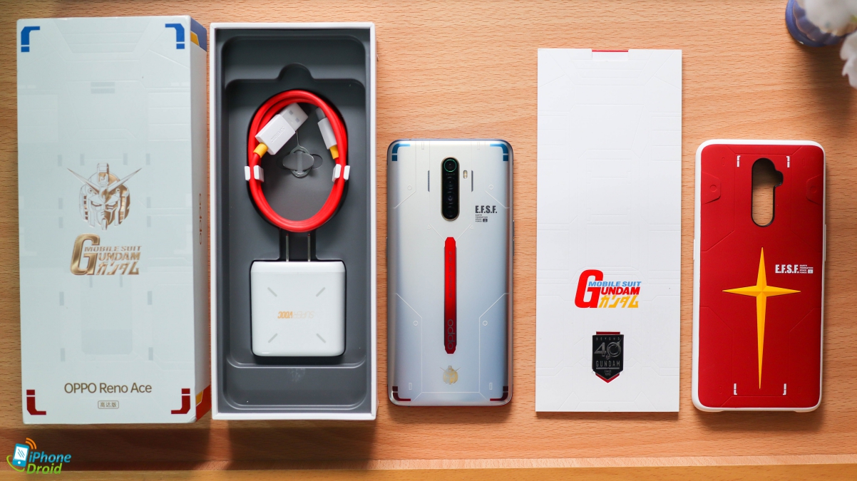แกะออกมาก็จะพบกับกล่องคู่มือต่างๆ เป็นชั้นแรกพร้อมด้วยลวดลายกันดั้ม ถัดไปอีกชั้นก็จะเป็นตัวเครื่อง OPPO Reno Ace Gundam Edition ที่อยู่ในซองอย่างสวยงาม และลึกลงไปอีกชั้นก็จะเป็นเคสสีแดงที่เป็นลวดลายโล่ของ RX-78-2 โดยที่อุปกรณ์ที่เหลือจะเป็นอะแดปเตอร์ SuperVOOC 2.0 ที่ให้กำลังไฟถึง 65W เรียกว่ามากที่สุดในโลก ณ ตอนนี้ พร้อมด้วยสาย USB Type-C ที่เป็นเส้นสีแดงครับ