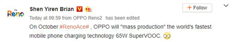 Brian Shen ได้กล่าวผ่าน Weibo ของตัวเองว่าในเดือนตุลาคมนี้ OPPO จะเปิดตัวสมาร์ทโฟนที่ชาร์จเร็วที่สุดในโลกด้วยเทคโนโลยี SuperVOOC 65W ซึ่งเป็น SuperVOOC ที่เร็วที่สุดในตอนนี้จากเดิมแค่ 50W เท่านั้น