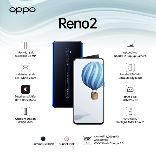 OPPO Reno2 สมาร์ทโฟนที่ถ่ายวิดีโอดีที่สุด ลดเหลือเพียง 9,499 บาท จากปกติ 15,999 บาท! และรับฟรี E-VIP Card รับประกันหน้าจอนาน 1 ปี