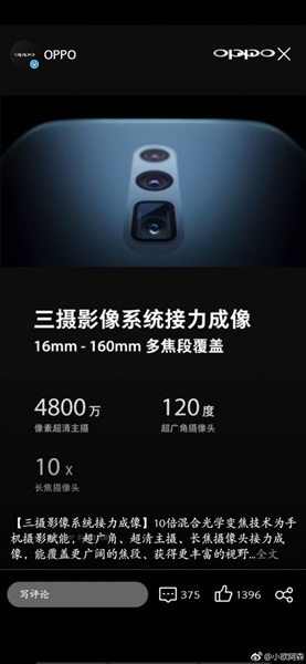 ตอนนี้ดูเหมือนว่าสมาร์ทโฟน OPPO Reno เองจะมีเรื่องให้เซอร์ไพรส์มากกว่าการติดตั้งเทคโนโลยีการซูม 10 เท่าเพราะว่าล่าสุดเว็บไซต์ Weibo ได้เปิดเผยรายละเอียดของสมาร์ทโฟนรุ่นนี้ให้เรารู้มากขึ้น เริ่มจากรายละเอียดของกล้องถ่ายรูปด้านหลัง ความละเอียด 48 ล้านพิกเซลซึ่งเป็นกล้องหลักจะใช้เซนเซอร์ของ Sony IMX586 sensor และมีเลนส์รูรับแสง f/1.5, f/2.4 Schneider-certified ติดตั้งมาด้วย นอกจากนั้นยังมีกล้องถ่ายรูปยังมีเป็นกล้องถ่ายรูปแบบ ultra-wide camera ที่สามารถเก็บภาพได้กว้าง 120°