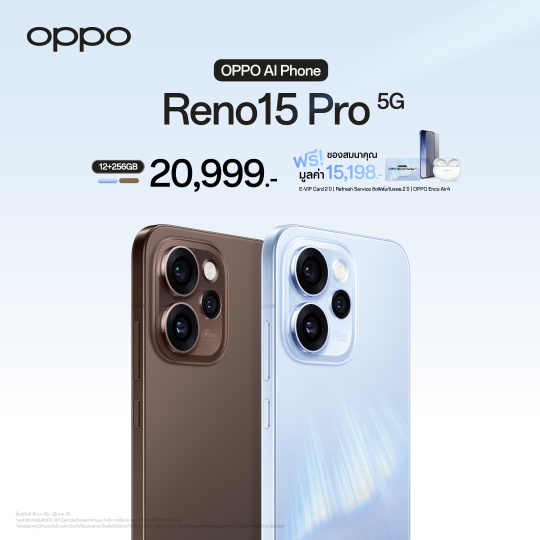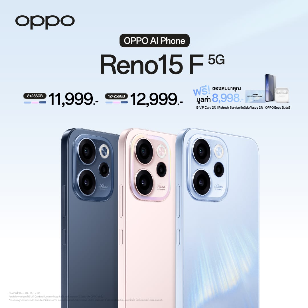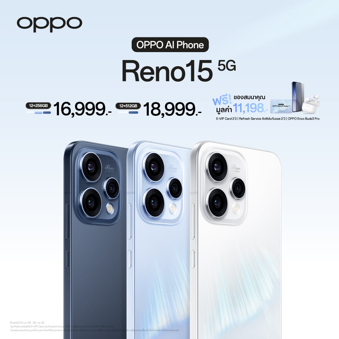 OPPO ประกาศวางจำหน่าย “OPPO Reno15 Series 5G” สมาร์ตโฟนเพื่อนซี้ เทรนดี้ทุกช็อต รุ่นใหม่ล่าสุด วางจำหน่ายในราคาสุดคุ้ม เริ่มต้นเพียง 11,999 บาท มาพร้อมโปรโมชั่นสุดพิเศษในช่วงวันนี้ – 28 กุมภาพันธ์ 2569 อีกทั้งยังมอบทุกประสบการณ์การใช้งานด้วย 2 ผลิตภัณฑ์ IoT ใหม่ อย่าง OPPO Watch S วางจำหน่ายในราคาเริ่มต้น 5,999 บาท และ OPPO Pad 5 ในราคาเริ่มต้น 13,999 บาท
